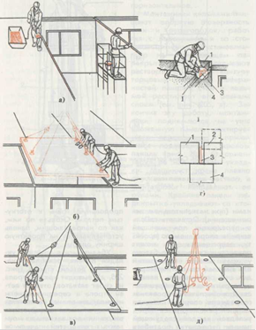 а - розстеляння розчину, б - укладання панелі, в - рихтування панелі, г - підгинання четель на опорній поверхні, д - розстроповка; 1 - панель перекриття, 2 - монтуєма панель, 3 - монтажна петля, 4 - внутрішня стінова панель.