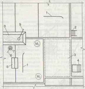 1 - ломи, 2 - сходи, 3 - місце яке укладається панелі, 4 - столик-драбина, 5 - ящик з інструментом, 6 - мітла, 7 - відро з водою, 8 - ящик з розчином, 9 - лопата; М1, і М2, - монтажники.