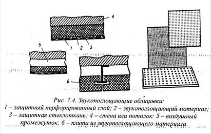 Установка звукопоглощающих облицовок снижает шум на 6-8 дБ в зоне отраженного звука (вдали от источника) и на 2-3 дБ вблизи источника шума. Несмотря на такое относительно небольшое снижение шума, применение облицовок целесообразно, так как спектр шума в помещении меняется за счет большой эффективности облицовок на высоких частотах. Шум делается более глухим и менее раздражающим, становится легче разговаривать, улучшается разборчивость речи.