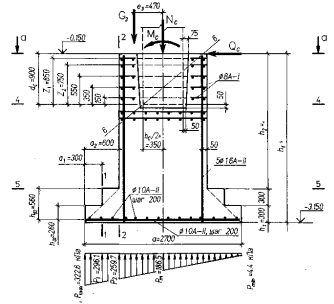 Армирование назначаем в соответствии с конструктивными требованиями в количестве не менее 0,05 % площади подколонника: As = A's = 0,0005·1200·1500 = 900 мм2. Принимаем As = A's = 1005 мм2 (5ø16 А-III).