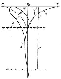 К ним относятся: значительные колебания температуры; промерзание и оттаивание грунтов; морозное пучение грунтов; миграция влаги к фронту промерзания; перемещение влаги под действием гидравлического градиента; образование морозобойных трещин; сползание грунта по склонам (солифлюкция); поверхностные оползни. Колебания температуры по глубине деятельного слоя 1 и слоя вечномерзлого грунта 2 (рис. 3.7) легко зафиксировать, измеряя температуру на разных глубинах в течение года в скважине результаты измерений приведены на рисунке, римскими цифрами указаны месяцы). Наибольшие колебания температуры испытывает самый верхний слой. С глубиной колебания уменьшаются, и ниже некоторой границы 3 температура практически постоянна. Эту границу называют границей нулевых амплитуд сезонных колебаний температуры.