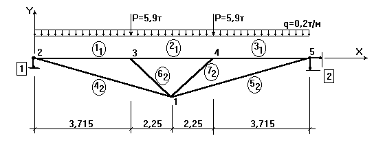 На схеме узлы обозначены цифрами, стержни - цифрами с индексом в кружках (индекс - номер типа сечения), опоры - цифрами в прямоугольниках. Размеры на чертеже в метрах.