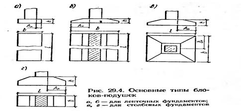 Первый тип элементов, укладываемых непосредственно на грунт или на подготовку из песка или тощего бетона, получил название блоков-подушек. Элементы, служащие для возведения основной конструкции фундамента, называются стеновыми блоками, поскольку в ленточных фундаментах они образуют подземную стенку, представляющую собой продолжение наземной стены здания. Блоки фундаментов, на которые непосредственно опираются колонны, называют башмаками. Конструктивные формы, размеры и материалы самих фундаментных блоков весьма разнообразны. В качестве материала для блоков применяют бетон и железобетон. Марки бетона для изготовления фундаментных блоков- подушек назначают в зависимости от водонасыщенности грунта основания. Блоки-подушки изготовляют трех типов: в виде прямоугольных параллелепипедов (рис. 29.4); плит, имеющих в одном направлении трапециевидное, а в другом — прямоугольное сечение (рис. 29.4,6, г), и плит, имеющих трапециевидное сечение в двух направлениях (рис. 29.4, в). Блоки-подушки, как правило, делают сплошными, причем блоки, представленные на рис. 29.4, а, — бетонными, а все остальные — железобетонными. В ленточных (стеновых) сборных фундаментах номинальная толщина шва между блоками принята равной 20 мм. Поэтому длина блока (размер по длине стены) принимается такой, чтобы вместе со швами получались размеры, кратные целым дециметрам. В прерывистых сборных фундаментах зазор между блоками определяется по расчету и достигает 900 мм.