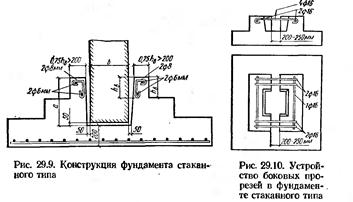 Основной тип сборного фундамента под колонну — башмак стаканного типа. Его изготовляют из железобетона, а конструкция башмака должна полностью соответствовать рекомендациям и требованиям, изложенным в разделе железобетонных конструкций. Конструктивное оформление фундаментного блока- башмака стаканного типа показано на рис. 29.9 и 29.10.