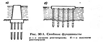 Группу свай, образующую свайный фундамент, поверху связывают жесткой конструкцией в виде балки или плиты, обеспечивающей передачу давления от сооружения на все сваи и препятствующей горизонтальному перемещению верхней части последней. Конструкции, связывающие головы свай, называют ростверками и выполняют в зависимости от материала свай и постоянного уровня грунтовых вод из дерева, бетона или железобетона. Различают ростверки высокие и низкие (рис. 30.1). Высокими называют ростверки, нижняя плоскость которых лежит выше поверхности грунта. Такие ростверки устраивают, когда поверхность грунта покрыта водой, например при строительстве набережных, мостовых опор и т. д. Однако возможно устройство высоких ростверков и при строительстве гражданских зданий, например при устройстве технического подполья.