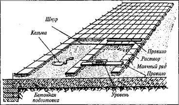 По мере устройства покрытия временные маячные ряды снимают, а контрольную рейку одним концом опирают вместо фриза на уложенные и выверенные ряды карт покрытия (рис.1.2.).