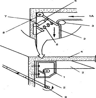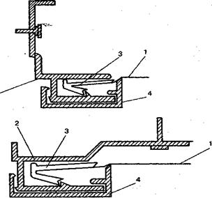 В конструкцию багета, представленного на указанном выше рисунке, входит фиксатор, с помощью которого пленка будет закреплена в процессе монтажа потолка. Принцип действия такого фиксатора сходен с работой храповика. Движение пленочного полотна вперед будет сопровождаться свободным скольжением фиксатора по поверхности пленки. В том случае, если пленка не движется, ее закрепление обеспечивается за счет растяжения пружины, которая, расправляясь, придавливает подвижный валик к рычагу.