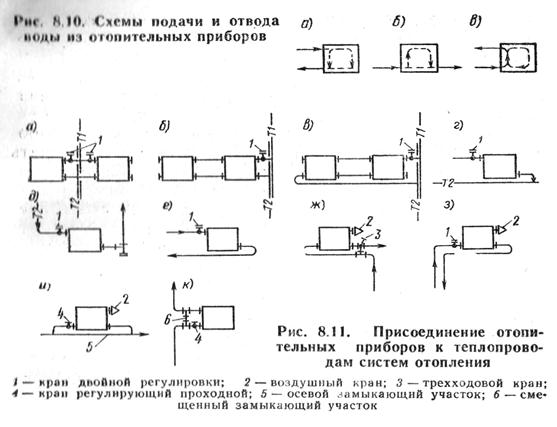 Хотя теплотехнически преимущество имеет разностороннее присоединение теплопроводов, на практике чаще используется одностороннее присоединение, позволяющее унифицировать узел «обвязки» прибора, что важно для зданий массового строительства. Присоединение приборов по схеме «снизу вниз» чаще всего осуществляется в верхнем этаже вертикальных однотрубных и двухтрубных систем с нижней прокладкой обеих магистралей (рис. 8.11, ж, з) и в горизонтальной однотрубной системе (рис, 8.11, и). Присоединение приборов по схеме «снизу вверх» применяется в однотрубных (рис. 8.11, к) и двухтрубных системах отопления с нижней прокладкой обеих магистралей.