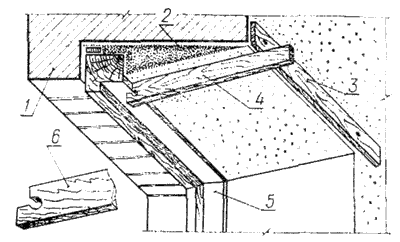 1 — стена; 2 — раствор; 3 — рейка; 4 — положение малки при оштукатуривании откоса; 5 — коробка; 6 — малка