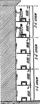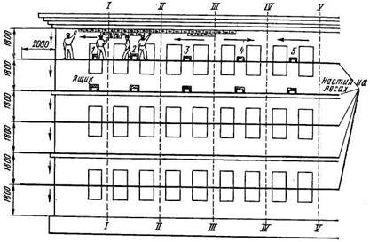 В том случае, когда на фасаде нет пилястр, но есть междуэтажные пояски, захватки можно устраивать поэтажно, но так, чтобы настил делил по высоте этаж пополам (рис.2).
