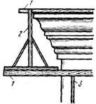 Первый способ (рис.5, а). Нижнее правило навешивают обычным способом, а верхнее 3 с помощью планок 2 прикрепляют к тонкому бревну 1 (подтоварнику) или к толстым доскам, уложенным в водосточный желоб. Запрещается подбивать планки под желоба для крепления правил, потому что планки поднимут желоб, а забиваемые гвозди пробьют кровлю.