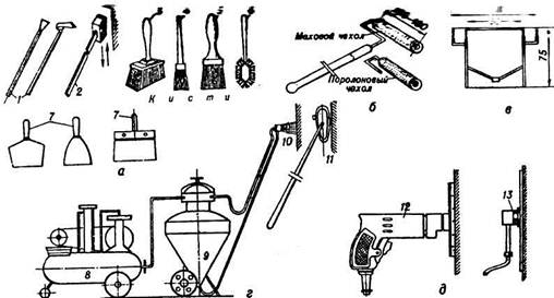 а — ручные инструменты, б — окрасочный валик, в — вискозиметр ВЗ-4, г — агрегат для нанесения шпаклевки, д — шлифовальные машины, 1 — скребки, 2 — держатель для лещади, 3 — макловица, 4 — ручник, 5 — флейц, 6 — кисть для окраски радиаторов, 7 — шпатели, 8 — компрессор, 9 — пневмонагнетательный аппарат, 10 — форсунка для нанесения шпаклевки, 11 — приспособление для шлифовки вручную, 12 — шлифовальная машинка (электрическая), 13 — то же, пневматическая.
