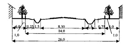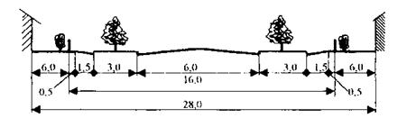 Для каждой улицы разрабатывают поперечный профиль – изображение улицы в вертикальном разрезе перпендикулярно ее оси. На профиле показывают размещение и размеры всех составляющих улицу элементов. Поперечный профиль дает представление не только о горизонтальном расположении и размерах элементов улицы, но и о ее высотной организации. Такой профиль называют архитектурным. Он дополняет начертание улицы в плане, показывая ее пространственный вид и раскрывая архитектурный облик улицы (рисунок 2).