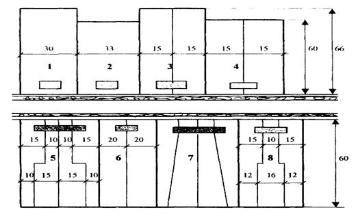 б) при блокированных домах, на одну квартиру выделяется 0,075 га, для размещения хозяйственных построек.Участки блокированных домов делят на равные части. Наиболее целесообразные варианты деления участков при доме показаны на рисунке 3.