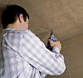 По сделанным меткам просверлите в потолке и стенах отверстия на глубину приблизительно 40 мм и вставьте деревянные или пластмассовые дюбели.
