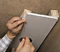 Приклеив кусочки гипсокартона на серпянку, прикрепите шурупами получившуюся боковую стенку к потолочным брускам так, чтобы ее нижний край совпал с нижней плоскостью листа