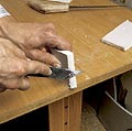 Наметьте в заготовке отверстия для крепления шурупов и приверните лист гипсокартона к нижней плоскости брусков. Боковую поверхность профиля составляйте из отдельных полосок гипсокартона, обработанных под углом. Но лучше использовать для изготовления "боковушки" лист оргалита.