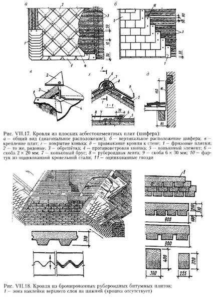 Кровлю из плоского шифера — асбестоцементных листов (второе бытовое название этернит) — устраивают по сплошной или разреженной (с зазором 10— 20 мм) обрешетке из досок толщиной 25—32 мм. Рядовые плитки имеют размеры 400 х 400 и 300 х 300 мм. Кроме того одновременно применяют также краевые, фризовые и коньковые плитки (рис. VII.17). Рекомендуется применять плитки, покрашенные в заводских условиях. Цвета — по указанию проектировщика. Плитки крепятся к настилу гвоздями, а между собой — с помощью противоветровых кнопок, специальных крючков или скоб.