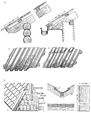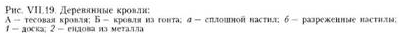 Деревянные кровли выполняются из теса, гонта, драни и щепы. Первые два типа предпочтительнее по внешнему виду. Тесовые кровли устраиваются из сосновых досок (теса), из осиновых досок толщиной 13—25 мм, а шириной 150—200 мм. Доски укладываются вдоль скатов в два ряда; либо сплошным настилом с перекрытием швов, либо разреженным настилом (рис. VII. 19). Промежуток между досками нижнего и верхнего рядов в этом случае не должен превышать 0,5 ширины досок. В o6oих случаях сопряжение досок соответствует типу B1 по рис. VII.10. В связи с этим уклон скатов должен быть > 50°. Верхние поверхности досок и боковые кромки верхнего ряда сострагиваются. Существенно расположение досок с учетом годовых колец: в верхнем ряду выпуклостью вверх, в нижнем — вниз. Это обеспечивает коробление досок при усушке с образованием профилей поперек скатов, подобных татарской черепице. Для улучшения стока воды вдоль ската и предотвращения растекания воды в поперечном направлении в каждой доске устраиваются желобки. Обрешетка выполняется из брусков или досок с шагом 500—600 мм. Доски нижнего ряда крепятся к обрешетке гвоздями, которые следует располагать под досками верхнего ряда, а доски верхнего ряда крепятся гвоздями по краям досок. Кровля проста в изготовлении, экономична, но не долговечна, подвержена короблению и возгоранию.