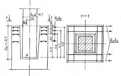Рабочая вертикальная арматура устанавливается у коротких граней подколонника (рис. 6.6). Расчет арматуры производится как внецентренно сжатого элемента по усилиям в сечении 1-1 (коробчатое, приводимое к двутавровому) и по усилиям в сечении 2-2 (сплошное прямоугольное).