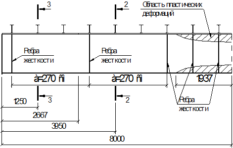Расстановку вертикальных ребер жесткости принимаем согласно рисунку на стр. 30, через промежуток а = 270 см. Это расстояние удовлетворяет условию СНиПа II-23-81* (п. 7.10), которое между основными поперечными ребрами не должно превышать 2·hw, т.к.