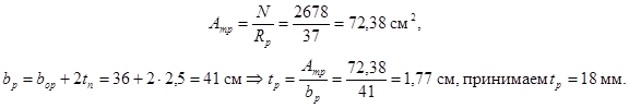 Плита поддерживается ребрами, приваренными к стенке колонны. Толщину ребер определяем из условия смятия. Требуемая площадь смятия: