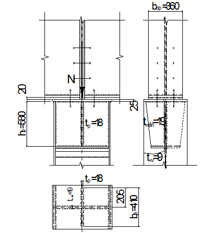 На колонну со сплошной стенкой свободно сверху опираются балки. Усилие на стержень колонны передается опорными ребрами балок через плиту оголовка. Ширина опорных ребер балок bp = 360 мм. На колонну действует продольная сила N = 2678 кН. Торец колонны фрезерован. Толщину плиты оголовка принимаем равной tf = 25 мм.