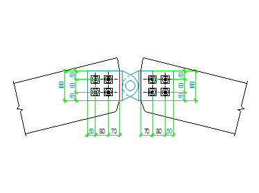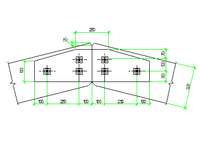 Торцы клееных блоков ригеля в узле соединяем впритык не по всей высоте, а со срезом крайних досок под углом по 25 мм для большей шарнирности узла и предотвращения откола крайних волокон при повороте элементов шарнирного узла. Боковая жесткость узла обеспечивается постановкой парных накладок сечением 200x125 мм на болтах d=20 мм.