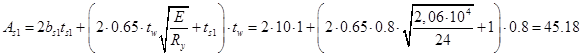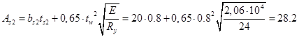 Устойчивость из плоскости стенки проверяется с учетом участия в работе части принадлежащей стенки балки. В этом случае площадь, момент инерции, радиус инерции поперечного сечения и гибкость условного стержня будут равны