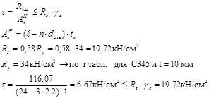 Проверяем накладку на срез с учетом ослабления отверстиями под болты.