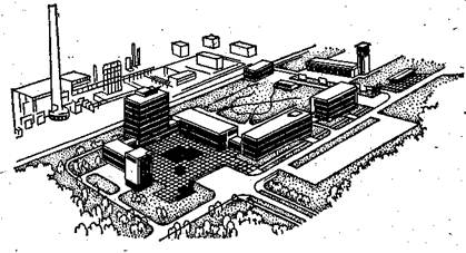 Для создания оригинального архитектурного решения рекомендуется выделять отдельные объемы зданий, а здание заводоуправления сооружать с повышенной этажностью. На рис. 1.3 приведено архитектурное решение предзаводской зоны одного из современных НПЗ.