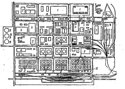 1-комбинированные установки по переработке нефти; 2-установки вторичной переработки 3-товарные парки; 4 -парки нефти; 5-узлы оборотного водоснабжения; 6-автоматические станции смешения; 7 - ремонтно-механическая база; в - база оборудования; 9-факелмые свечи; 10- факельное хозяйство; 11-железнодорожные наливные эстакады; 12 -товарные насосные; 13 - топливное хозяйство; 14 - реагентное хозяйство; 15 -воздушные компрессорные; 16 — заводоуправление.