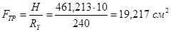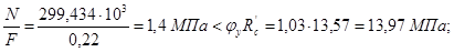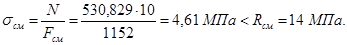 Торец арки проверяем на смятие. Величина напряжений смятия при действии расчетной продольной силы не должна превышать расчетного сопротивления смятию (RСМ=14 МПа). Усилие от шарнира передается на башмак длиной lб=600 мм. через гнутый швеллерный профиль двумя боковыми ребрами.