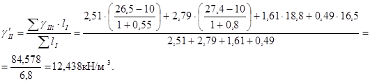 Средневзвешенное значение удельного веса слоев грунта, залегающих выше подошвы условного фундамента, с учетом взвешивающего действия воды ниже уровня подземных вод: