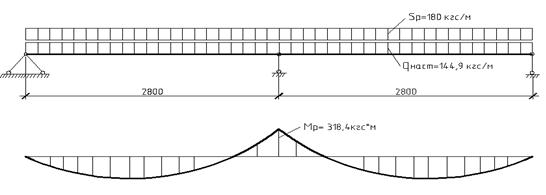 Расчетную схему принимаем в виде 2-х пролетной балки с пролетом равным 2,8м.