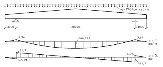 Рис.4. Расчетная схема балки покрытия с эпюрами моментов и поперечной силы.