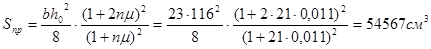 Iпр = (bh3/12) × [(1+4nμ)/(1+nμ)]= (23 * 1393 / 12) * [(1+4 * 21 * 0.011) / (1+21 * 0.011)] = 8045221 см4