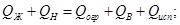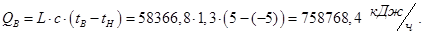 где QЖ- количество тепла выделяемого животными, кДж/ч.; QН- теплопроводность отопления (QН= 70447,77) кДж/ч.; Qогр – теплопотери помещения через конструкции кДж/ч.; QВ – количество тепла нужного для приточного воздуха кДж/ч.; Qисп – испарение влаги с пола помещения кДж/ч. Количество тепла необходимого для нагрева приточного воздуха, кДж/ч: