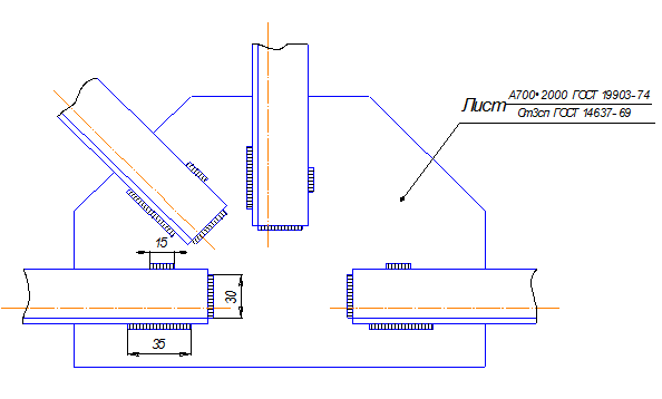 Для расчета сварного соединения фасонки (рис.16) и стержней в узле фермы, находим суммарную длину фланговых и лобового швов в соединении, для чего исходя из условия прочности сварного соединения, находим допускаемое напряжение среза: