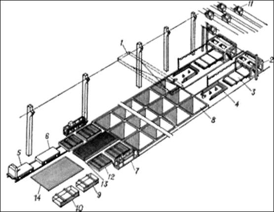 1 — мостовой кран; 2 — бетоноукладчик; 3 — виброплощадка; 4 — формоукладчик; 5 — самоходная тележка для вывоза готовых изделий; 6 — тележка-прицеп; 8 — камеры пропаривания; 9 — стенд для контроля и ремонта изделий; 11 — раздаточный бункер; 12 — формы; 14 — площадка складирования готовой продукции.