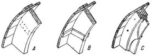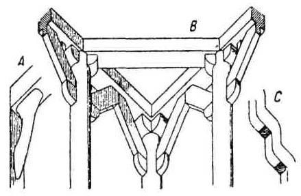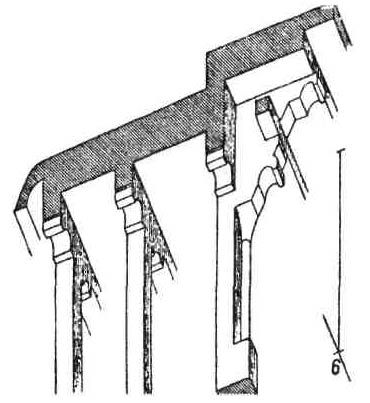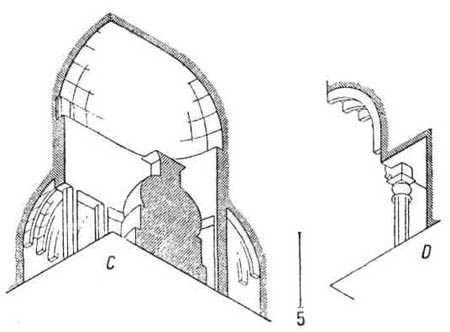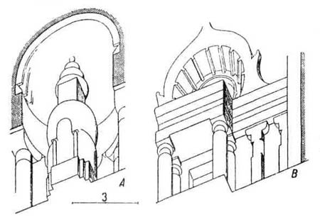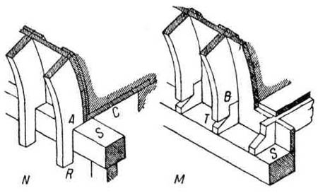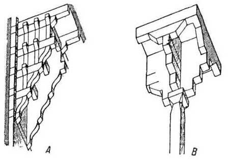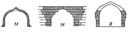 Пещерные храмы, не принадлежа специально какой-нибудь определенной местности, заметным образом преобладают к югу от Нербудды (область К): здесь находятся гроты Аджанты и Карли. К северу от Нарбудды (область А) гора Абу — очаг джайнизма — является местом распространения каменной архитектуры, подражающей треугольным деревянным конструкциям. Тут мы находим самые яркие примеры храмов с покрытиями, выполненными горизонтальной кладкой плит (рисунок 111,5).