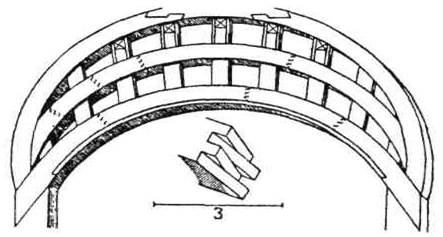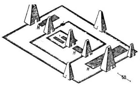 Постепенное увеличение храмов — Подобно храмам Египта, главнейшие храмы Индии создавались постепенно, путем добавления святилищ и оград к первоначальной части. Сановное святилище составляет ядро, перед которым возводится второе святилище; общая ограда охватывает эти строения; потом появляется новый храм, новая ограда и т. д. Рисунок 124, взятый из книги Рам-Раза об архитектуре Индии, показывает общее расположение таких концентрических оград, по форме и плану расположения пилонов напоминающих ансамбль храма в Карнаке.