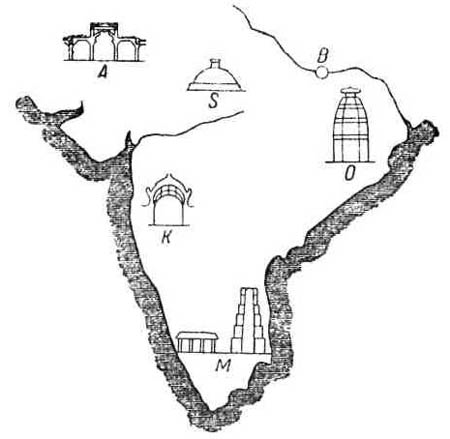 На прилагаемой карте Индии (рис. 125) показано географическое распределение различных типов храмов.