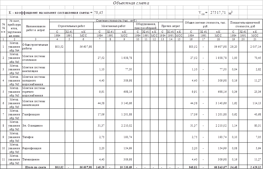 Сметная стоимость строительства определяется объектной сметой составленной по укрупненным показателям стоимости общестроительных и монтажных работ в ценах 1984 г и приведенной к текущим ценам (3 кв. 2007 г.) с помощью коэффициента (индекса) изменения сметной стоимости строительства в уровне текущих цен.