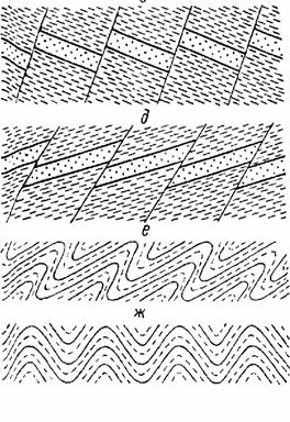Рис. 1. Примеры симметричного распределения геологических структурных форм. б — "лестничные" жилы; д — ступенчатый сброс; е — наклонные складки; ж — прямые складки.