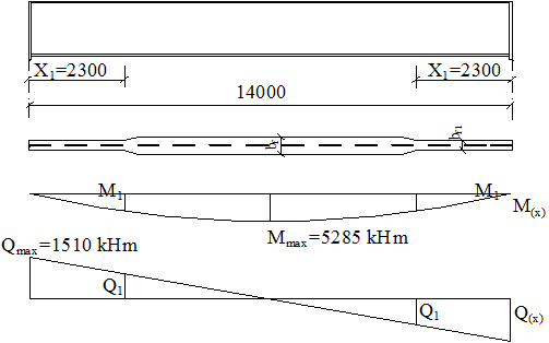 Принимаем место изменения сечения на расстоянии 2,3 м от опор, т.е. приблизительно 1/6l, как показано на рисунке 8.