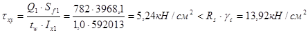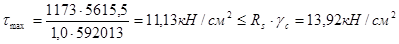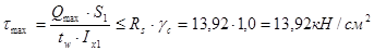 Проверяем максимальное касательное напряжение в стенке на опоре балки: