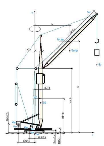 В данном случае к опрокидывающим относятся моменты, создаваемые ветровой нагрузкой, а моменты, создаваемые весами элементов крана относятся к удерживающим с соответствующим знаком.