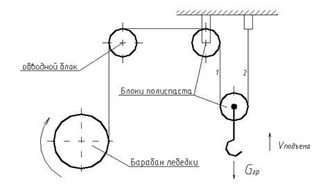 Кратность полиспаста m = 2, число обводных блоков n = 1