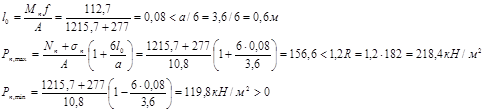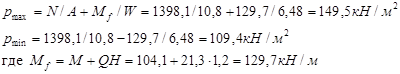 p = N/A = 1215,7/10,8 = 112,6 кН/м2; Rbt = гb2·Rbt = 1,1·0,66 = 0,726 МПа = 726кН/м2